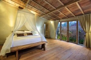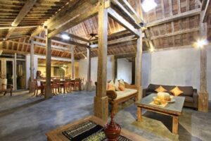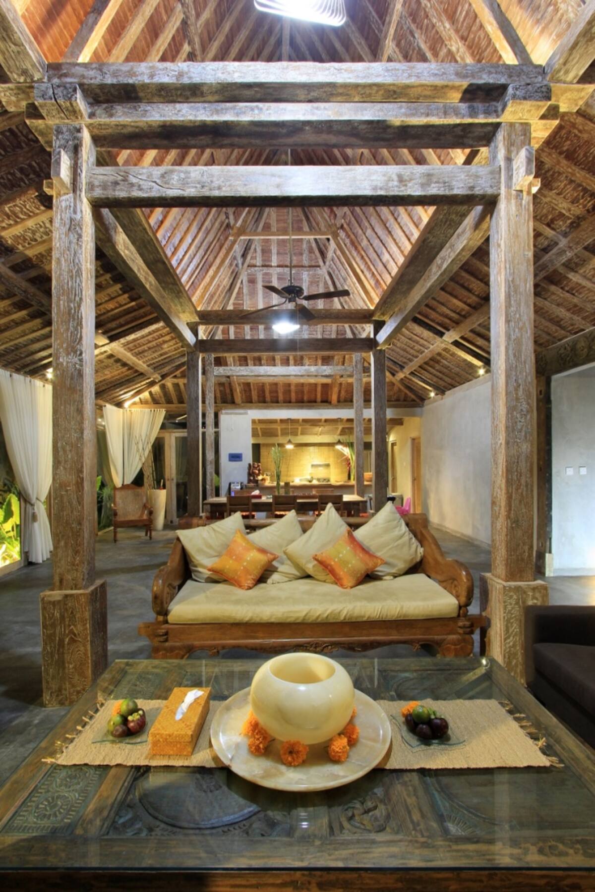 Rumah Tyang Ubud brings together two elegant, 100-year-old noble Javanese houses, restored with vintage wood and a warm, rustic character. Behind your private entrance is a villa that’s entirely yours: a private pool, bathrooms with plush towels and open-air rainfall showers, and breakfast included for up to six guests. Parking is right at the door, and the setting is a true Ubudian village—expect roosters, birds, dogs, and frogs in the distance, but not people or loud music. It’s peaceful by design: a place to relax in a beautiful pool house and feel at home.